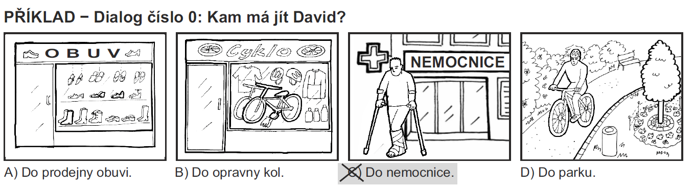 Poslechněte si 5 dialogů. Každý dialog uslyšíte 2x. Pak vyberte 1 správné řešení pro úkoly 1–5. Číslo 0 je příklad. Teď si poslechněte příklad.